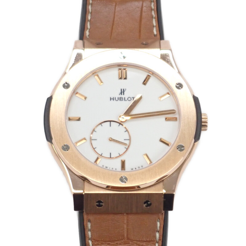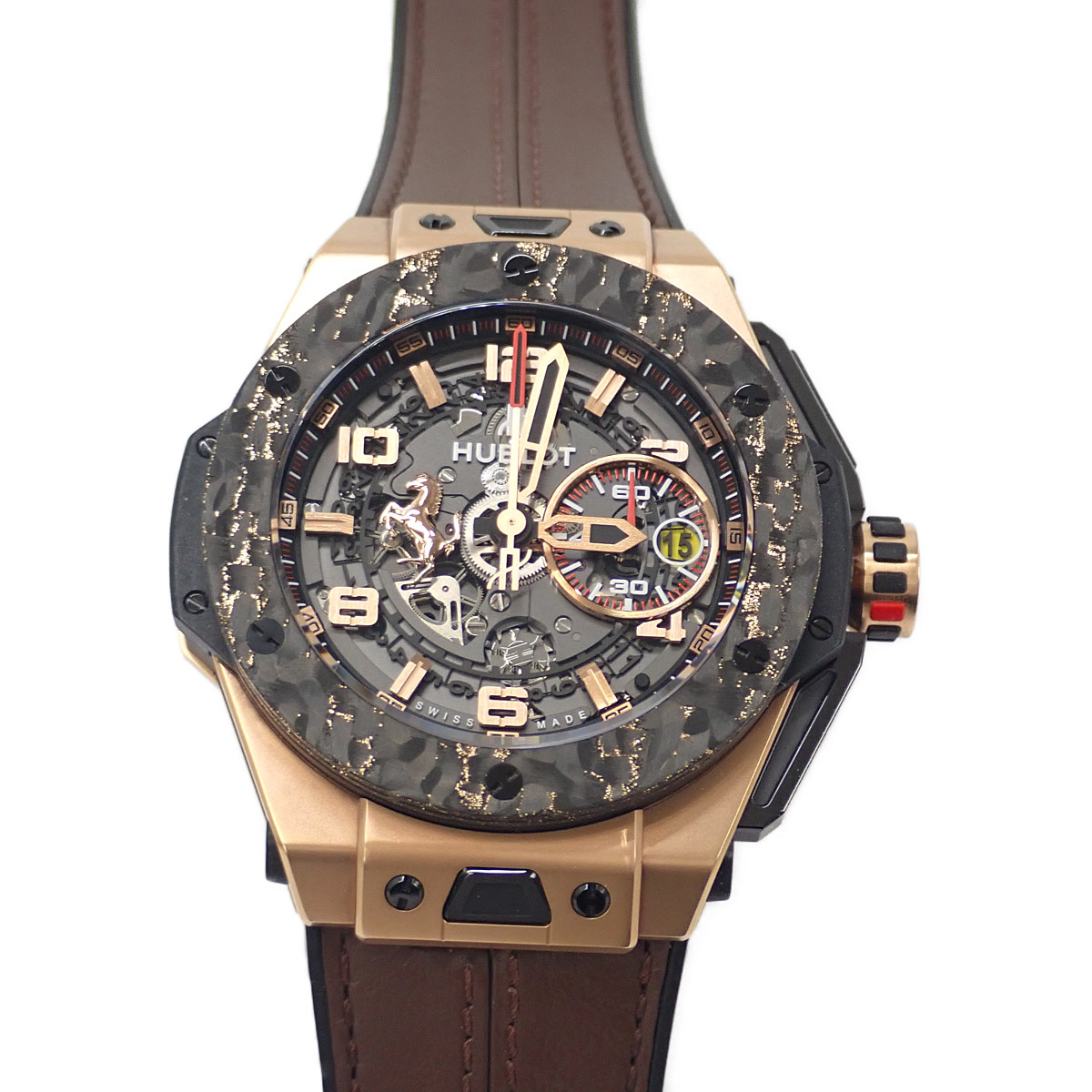 ウブロとはスイスの高級時計ブランドで1980年に創業されました。ブランド名はフランス語で「舷窓(げんそう)」を意味し、その独創的なベゼルデザインに由来します。ラバーとゴールドなど異素材の融合「フュージョンコンセプト」で注目され、スポーティでラグジュアリーなスタイルが特徴です。